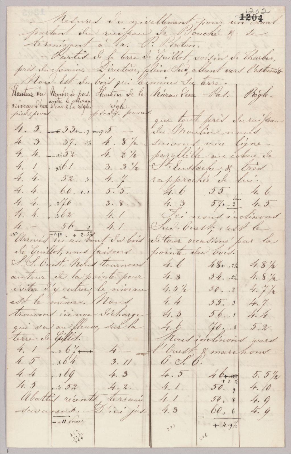 Mesures du nivellement pour un canal partant du ruisseau de Bouché et se terminant à la Pointe Platon. Plan inclus