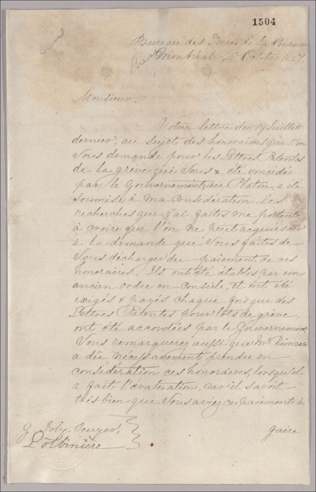 Lettre de Denis-Benjamin Papineau à Gustave Joly, 4 octobre 1847, Archives nationales à Québec, Fonds Famille Joly de Lotbinière, (03Q,P351,S3,P1504).