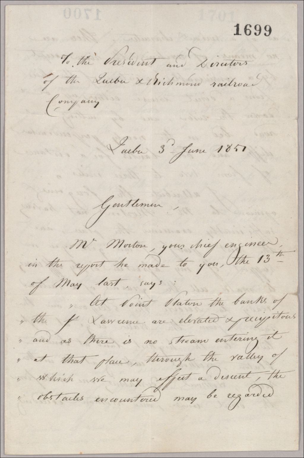 Lettre de Gustave Joly au président et directeur du Québec & Richmond Ry. Co