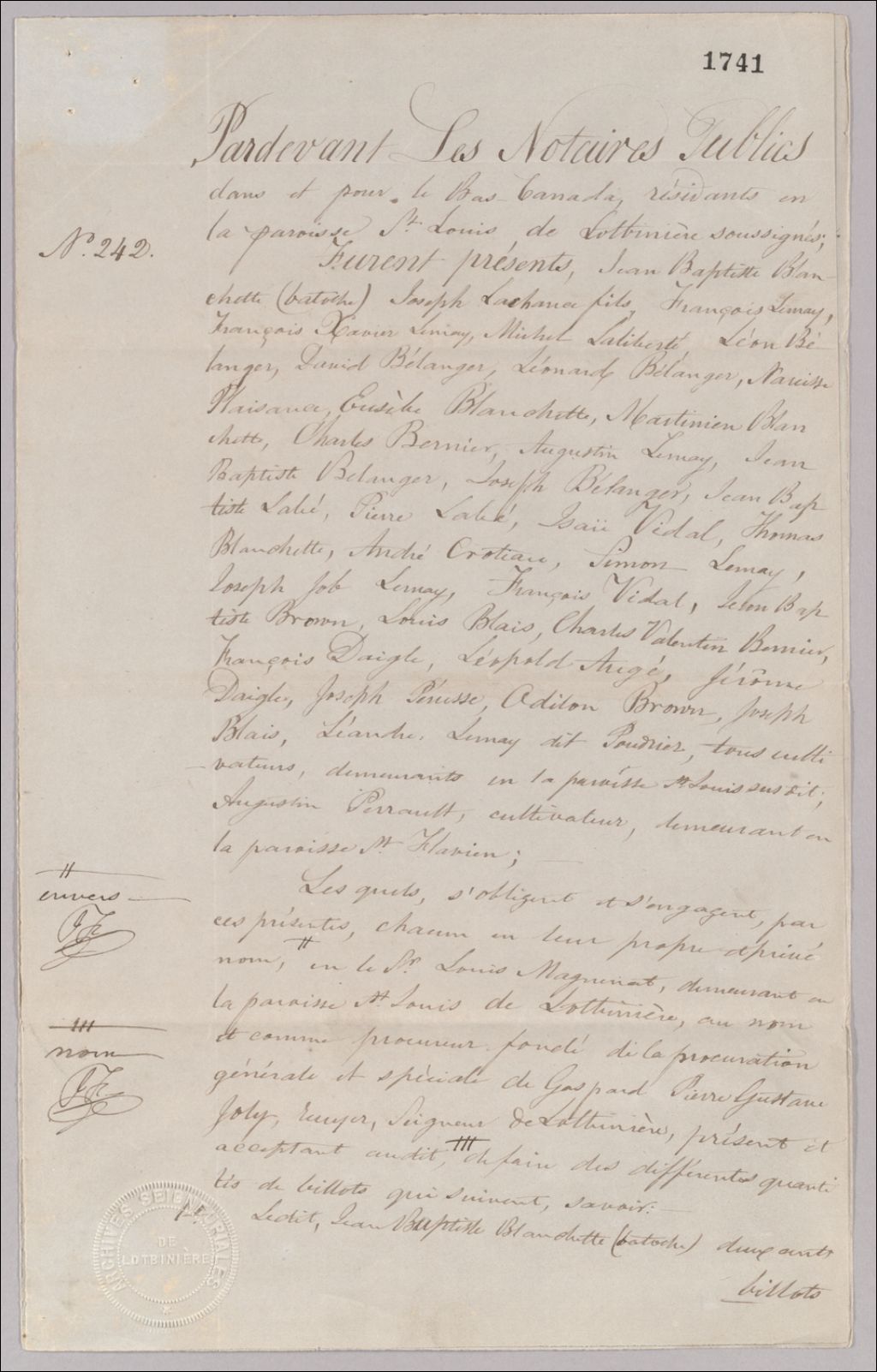 Marché de billots entre Jean-Baptiste Blanchette et autres envers Louis Magnenat, 10 novembre 1851, Archives nationales à Québec, Fonds Famille Joly de Lotbinière, (03Q,P351,S3,P1741).