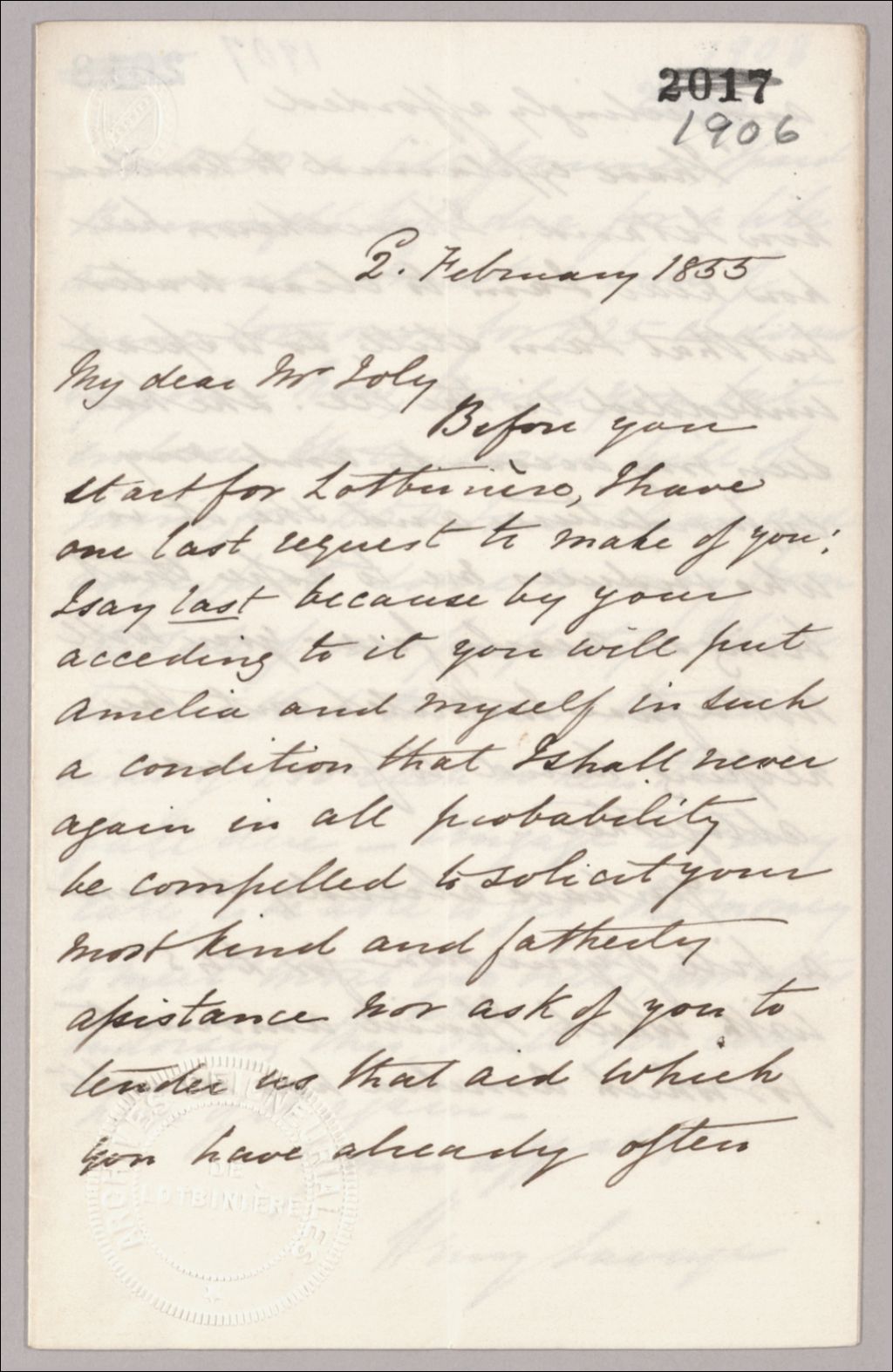 Lettre de Henry Savage à son beau-père, Gustave Joly, 2 février 1855, Archives nationales à Québec, Fonds Famille Joly de Lotbinière, (03Q,P351,S3,P1906).