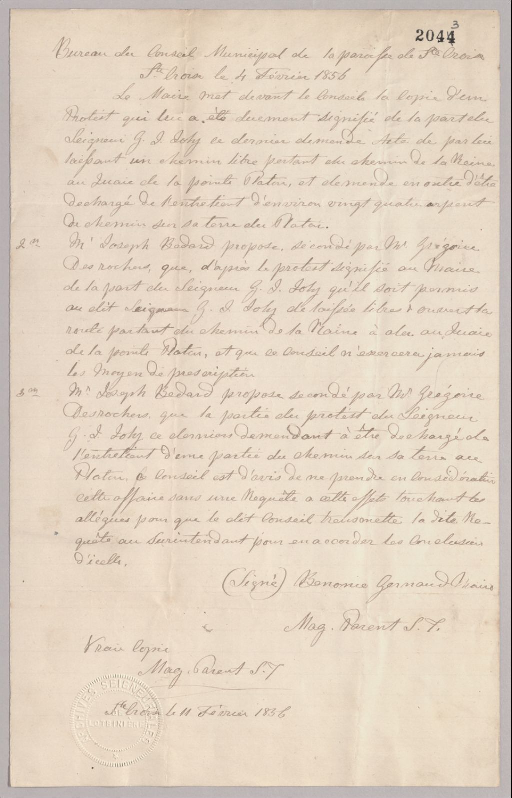 Le prôtet contre Benoni Garneau concernant l’entretien de chemins a été déposé au Conseil municipal, 11 février 1856, Archives nationales à Québec, Fonds Famille Joly de Lotbinière, (03Q,P351,S3,P2043).