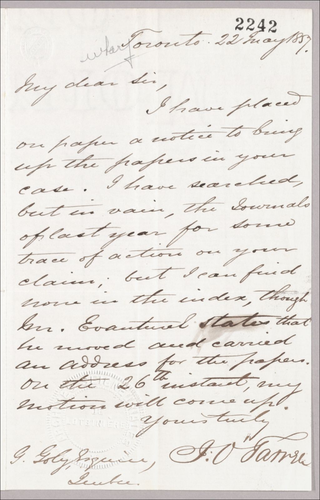 Lettre de J. O’Farrell à Gustave Joly, 22 mai 1857, Archives nationales à Québec, Fonds Famille Joly de Lotbinière, (03Q,P351,S3,P2242).