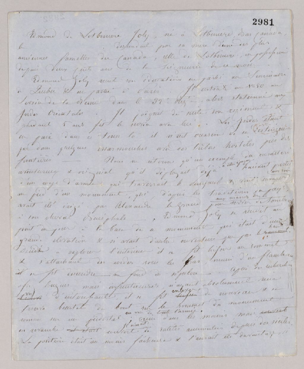 Notes sur Edmond Joly, faites par Gustave Joly, 1861, Archives nationales à Québec, Fonds Famille Joly de Lotbinière, (03Q,P351,S3,P2981).