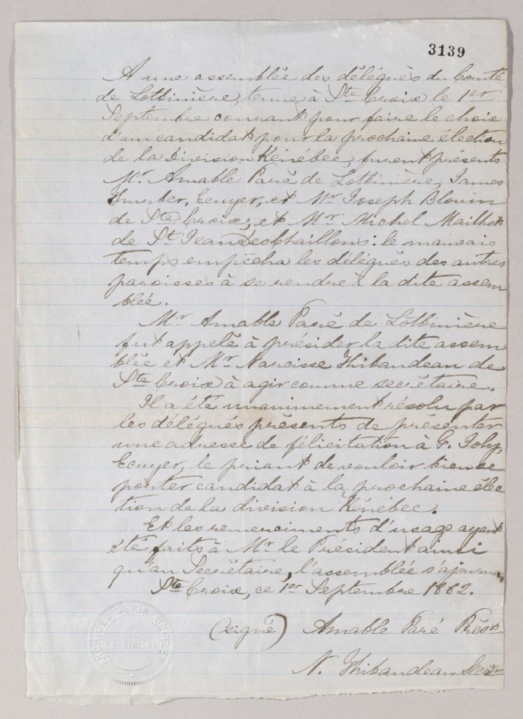 Lettre des délégués du comté de Lotbinière à Gustave Joly. On prie Joly de se porter candidat à la prochaine élection de la division Kennebec, 1er septembre 1862, Archives nationales à Québec, Fonds Famille Joly de Lotbinière, (03Q,P351,S3,P3139).