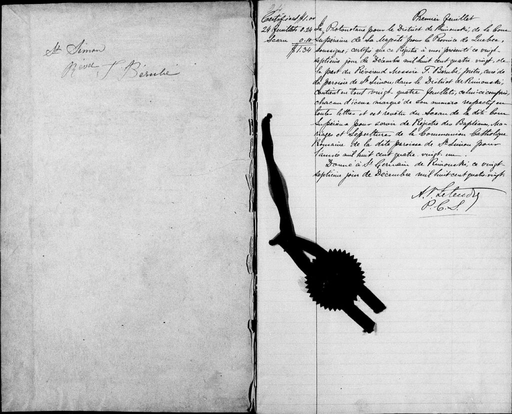 Saint-Simon-de-Rimouski, 1836-1921, Archives nationales à Rimouski, Fonds Cour supérieure. District judiciaire de Rimouski. État civil, (01R,CE101,S8).