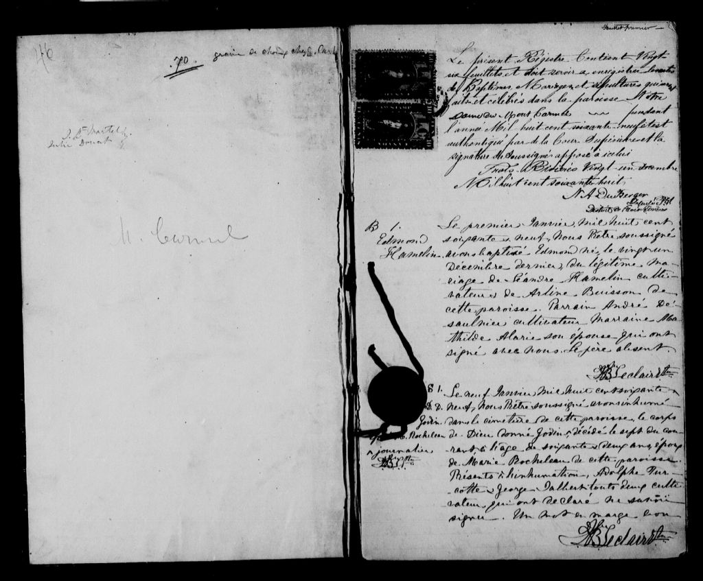 - Cette série regroupe les registres originaux de l'état civil, lesquels contiennent les enregistrements de baptêmes, de mariages et de sépultures consignés par le curé ou son représentant au cours de la période concernée par les documents.Outre les renseignements à caractère généalogique que nous pouvons y puiser, cette série peut constituer une source documentaire importante pour toute étude-statistique ou comparative sur les conditions de vie à différentes époques (mortalité infantile, espérance de vie) ou pour toute recherche portant sur l'occupation des terres (lieu de résidence), sur le mode de vie (métiers et professions, statut et âge des époux), sur les classes sociales (titres des parties impliquées, témoins/amis/parents présents lors d'un mariage), sur des évènements spéciaux (quelques mentions dans les sépultures) et sur des sujets à incidence médicale tels les maladies héréditaires (cause du décès)