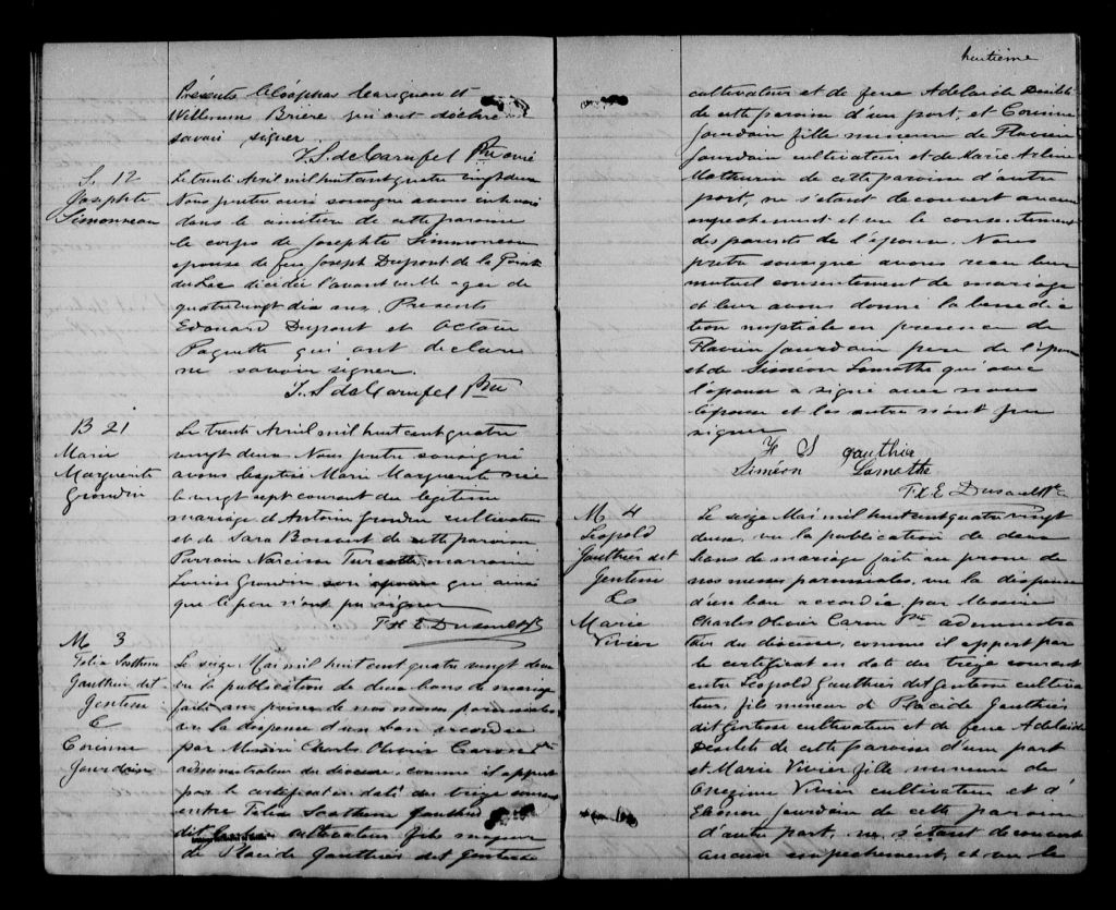 - Cette série regroupe les registres originaux de l'état civil, lesquels contiennent les enregistrements de baptêmes, de mariages et de sépultures consignés par le curé ou son représentant au cours de la période concernée par les documents.Outre les renseignements à caractère généalogique que nous pouvons y puiser, cette série peut constituer une source documentaire importante pour toute étude-statistique ou comparative sur les conditions de vie à différentes époques (mortalité infantile, espérance de vie) ou pour toute recherche portant sur l'occupation des terres (lieu de résidence), sur le mode de vie (métiers et professions, statut et âge des époux), sur les classes sociales (titres des parties impliquées, témoins/amis/parents présents lors d'un mariage), sur des évènements spéciaux (quelques mentions dans les sépultures) et sur des sujets à incidence médicale tels les maladies héréditaires (cause du décès)