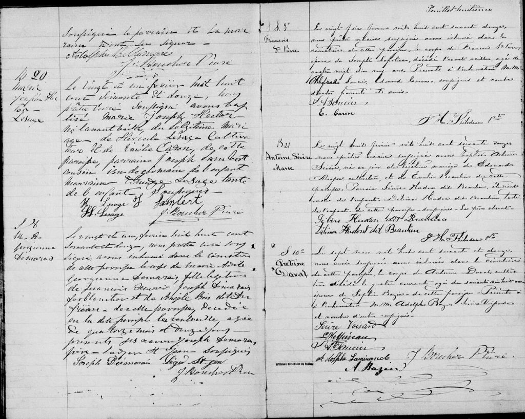 - Cette série regroupe les registres originaux de l'état civil, lesquels contiennent les enregistrements de baptêmes, de mariages et de sépultures consignés par le curé ou son représentant au cours de la période concernée par les documents.Outre les renseignements à caractère généalogique que nous pouvons y puiser, cette série peut constituer une source documentaire importante pour toute étude-statistique ou comparative sur les conditions de vie à différentes époques (mortalité infantile, espérance de vie) ou pour toute recherche portant sur l'occupation des terres (lieu de résidence), sur le mode de vie (métiers et professions, statut et âge des époux), sur les classes sociales (titres des parties impliquées, témoins/amis/parents présents lors d'un mariage), sur des évènements spéciaux (quelques mentions dans les sépultures) et sur des sujets à incidence médicale tels les maladies héréditaires (cause du décès)