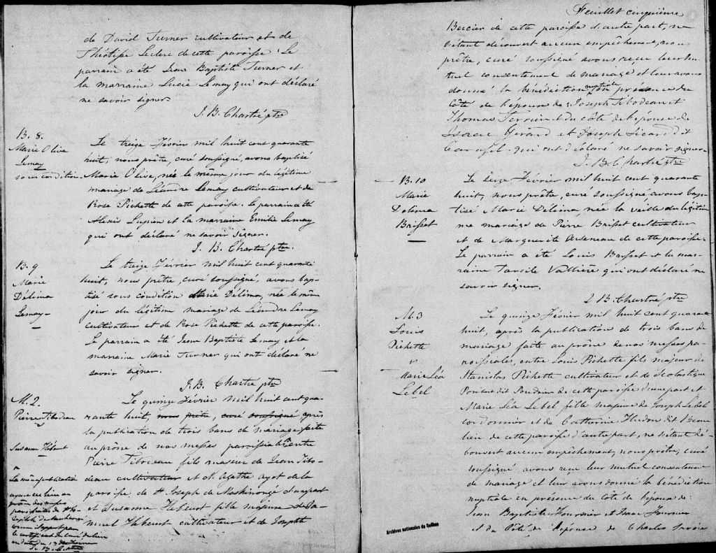 Cette série regroupe les registres originaux de l'état civil, lesquels contiennent les enregistrements de baptêmes, de mariages et de sépultures consignés par le curé ou son représentant au cours de la période concernée par les documents.Outre les renseignements à caractère généalogique que nous pouvons y puiser, cette série peut constituer une source documentaire importante pour toute étude-statistique ou comparative sur les conditions de vie à différentes époques (mortalité infantile, espérance de vie) ou pour toute recherche portant sur l'occupation des terres (lieu de résidence), sur le mode de vie (métiers et professions, statut et âge des époux), sur les classes sociales (titres des parties impliquées, témoins/amis/parents présents lors d'un mariage), sur des évènements spéciaux (quelques mentions dans les sépultures) et sur des sujets à incidence médicale tels les maladies héréditaires (cause du décès)