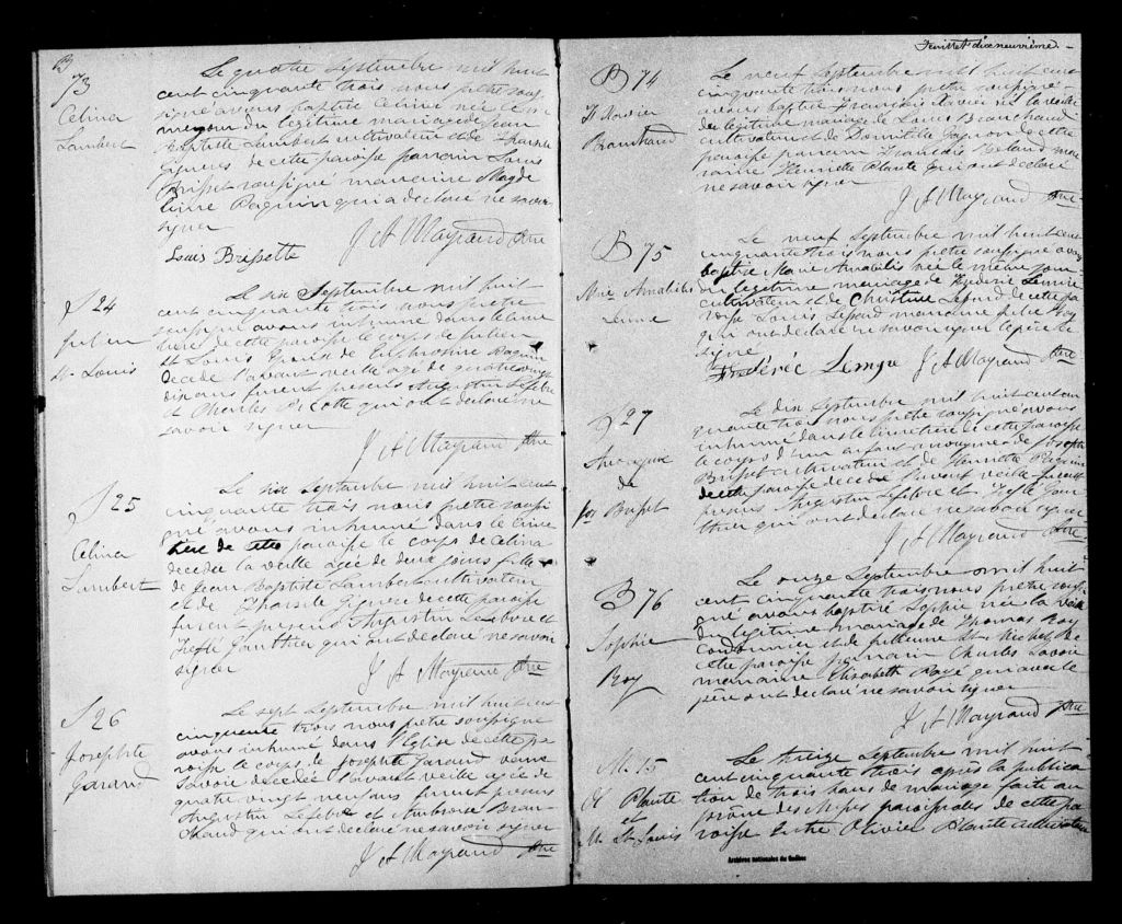 - Cette série regroupe les registres originaux de l'état civil, lesquels contiennent les enregistrements de baptêmes, de mariages et de sépultures consignés par le curé ou son représentant au cours de la période concernée par les documents.Outre les renseignements à caractère généalogique que nous pouvons y puiser, cette série peut constituer une source documentaire importante pour toute étude-statistique ou comparative sur les conditions de vie à différentes époques (mortalité infantile, espérance de vie) ou pour toute recherche portant sur l'occupation des terres (lieu de résidence), sur le mode de vie (métiers et professions, statut et âge des époux), sur les classes sociales (titres des parties impliquées, témoins/amis/parents présents lors d'un mariage), sur des évènements spéciaux (quelques mentions dans les sépultures) et sur des sujets à incidence médicale tels les maladies héréditaires (cause du décès)