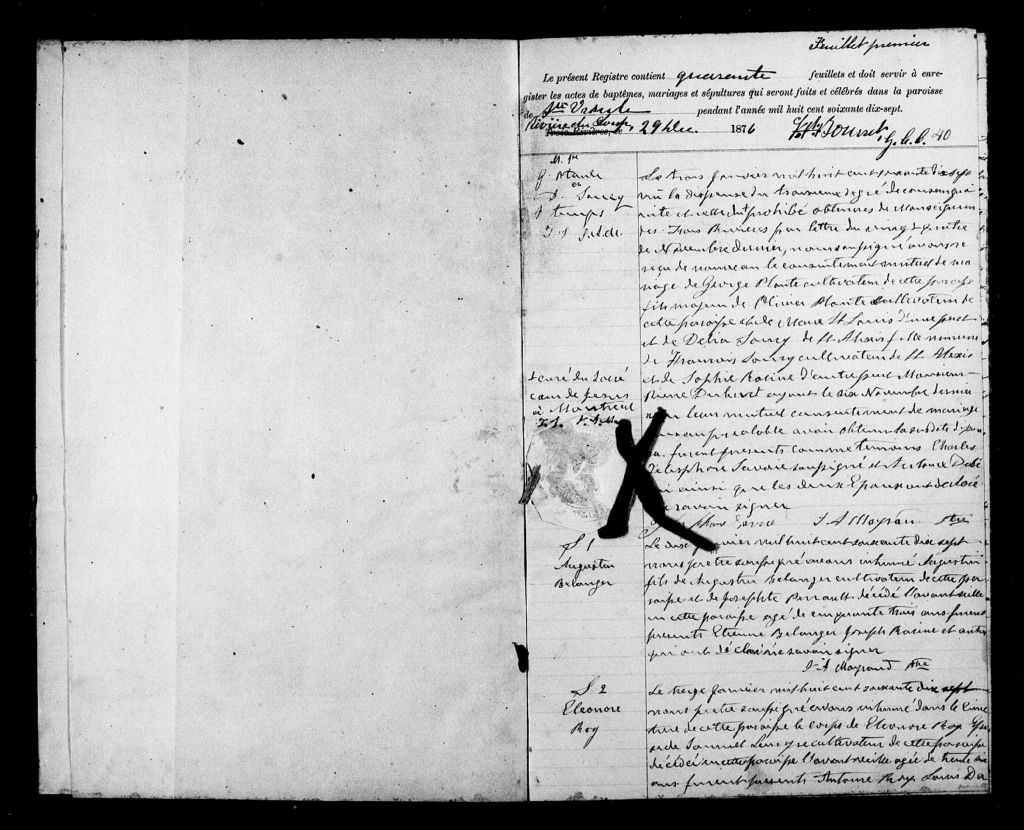 Cette série regroupe les registres originaux de l'état civil, lesquels contiennent les enregistrements de baptêmes, de mariages et de sépultures consignés par le curé ou son représentant au cours de la période concernée par les documents.Outre les renseignements à caractère généalogique que nous pouvons y puiser, cette série peut constituer une source documentaire importante pour toute étude-statistique ou comparative sur les conditions de vie à différentes époques (mortalité infantile, espérance de vie) ou pour toute recherche portant sur l'occupation des terres (lieu de résidence), sur le mode de vie (métiers et professions, statut et âge des époux), sur les classes sociales (titres des parties impliquées, témoins/amis/parents présents lors d'un mariage), sur des évènements spéciaux (quelques mentions dans les sépultures) et sur des sujets à incidence médicale tels les maladies héréditaires (cause du décès)