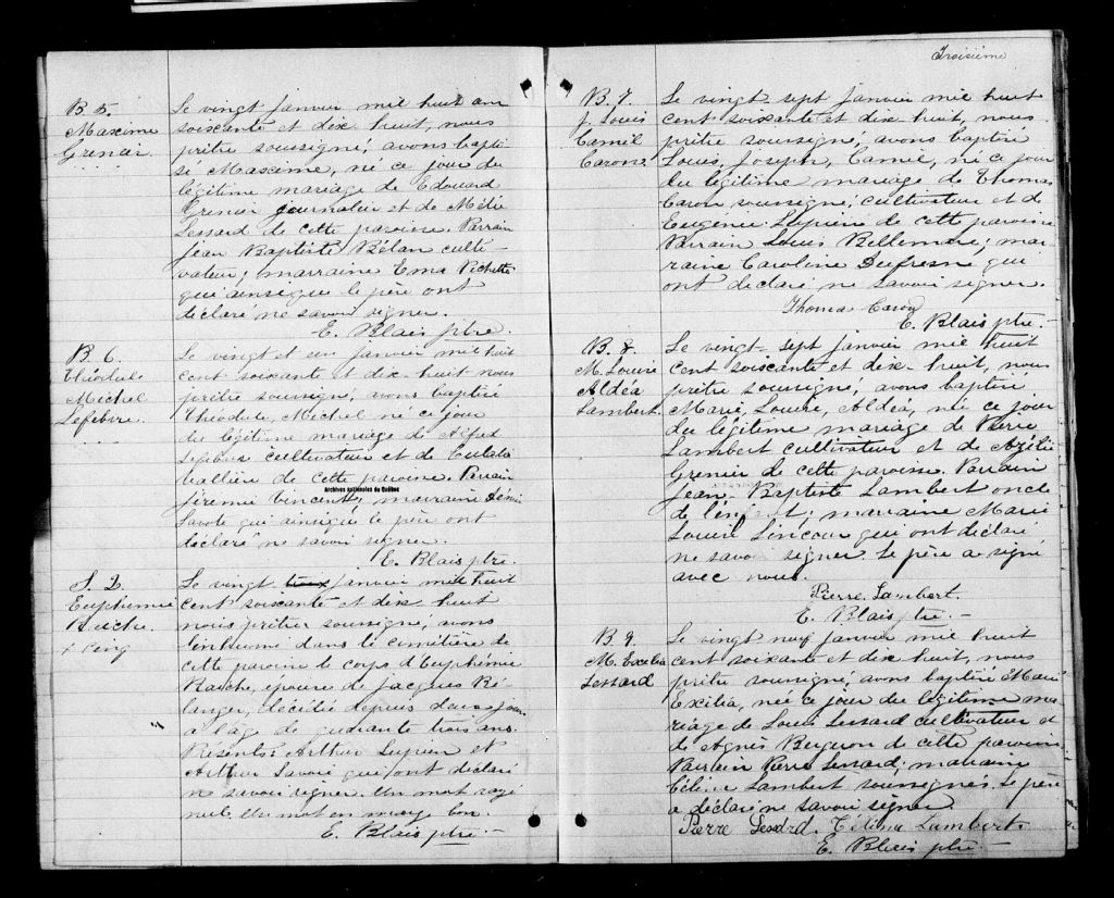 - Cette série regroupe les registres originaux de l'état civil, lesquels contiennent les enregistrements de baptêmes, de mariages et de sépultures consignés par le curé ou son représentant au cours de la période concernée par les documents.Outre les renseignements à caractère généalogique que nous pouvons y puiser, cette série peut constituer une source documentaire importante pour toute étude-statistique ou comparative sur les conditions de vie à différentes époques (mortalité infantile, espérance de vie) ou pour toute recherche portant sur l'occupation des terres (lieu de résidence), sur le mode de vie (métiers et professions, statut et âge des époux), sur les classes sociales (titres des parties impliquées, témoins/amis/parents présents lors d'un mariage), sur des évènements spéciaux (quelques mentions dans les sépultures) et sur des sujets à incidence médicale tels les maladies héréditaires (cause du décès)