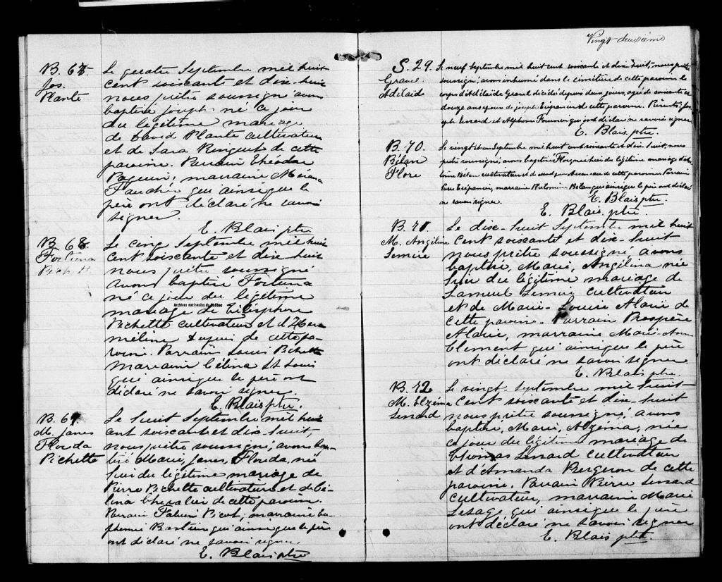 Cette série regroupe les registres originaux de l'état civil, lesquels contiennent les enregistrements de baptêmes, de mariages et de sépultures consignés par le curé ou son représentant au cours de la période concernée par les documents.Outre les renseignements à caractère généalogique que nous pouvons y puiser, cette série peut constituer une source documentaire importante pour toute étude-statistique ou comparative sur les conditions de vie à différentes époques (mortalité infantile, espérance de vie) ou pour toute recherche portant sur l'occupation des terres (lieu de résidence), sur le mode de vie (métiers et professions, statut et âge des époux), sur les classes sociales (titres des parties impliquées, témoins/amis/parents présents lors d'un mariage), sur des évènements spéciaux (quelques mentions dans les sépultures) et sur des sujets à incidence médicale tels les maladies héréditaires (cause du décès)