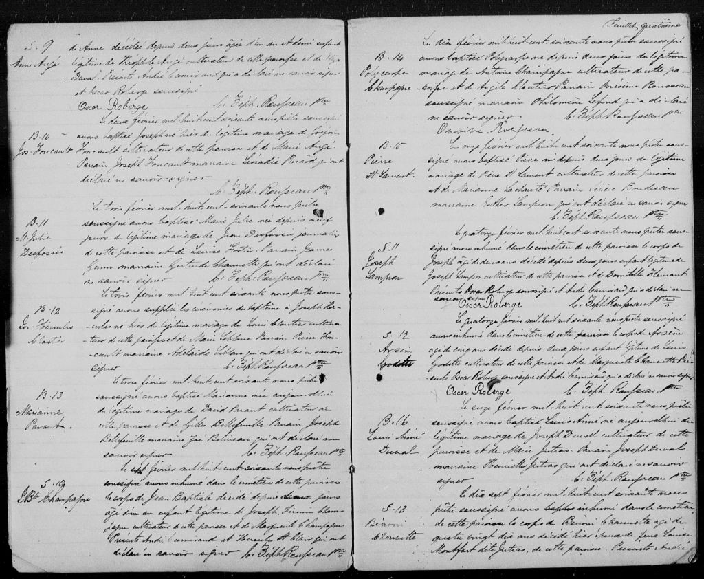 Cette série regroupe les registres originaux de l'état civil, lesquels contiennent les enregistrements de baptêmes, de mariages et de sépultures consignés par le curé ou son représentant au cours de la période concernée par les documents.Outre les renseignements à caractère généalogique que nous pouvons y puiser, cette série peut constituer une source documentaire importante pour toute étude-statistique ou comparative sur les conditions de vie à différentes époques (mortalité infantile, espérance de vie) ou pour toute recherche portant sur l'occupation des terres (lieu de résidence), sur le mode de vie (métiers et professions, statut et âge des époux), sur les classes sociales (titres des parties impliquées, témoins/amis/parents présents lors d'un mariage), sur des évènements spéciaux (quelques mentions dans les sépultures) et sur des sujets à incidence médicale tels les maladies héréditaires (cause du décès)