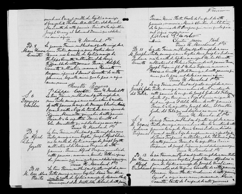 - Cette série regroupe les registres originaux de l'état civil, lesquels contiennent les enregistrements de baptêmes, de mariages et de sépultures consignés par le curé ou son représentant au cours de la période concernée par les documents.Outre les renseignements à caractère généalogique que nous pouvons y puiser, cette série peut constituer une source documentaire importante pour toute étude-statistique ou comparative sur les conditions de vie à différentes époques (mortalité infantile, espérance de vie) ou pour toute recherche portant sur l'occupation des terres (lieu de résidence), sur le mode de vie (métiers et professions, statut et âge des époux), sur les classes sociales (titres des parties impliquées, témoins/amis/parents présents lors d'un mariage), sur des évènements spéciaux (quelques mentions dans les sépultures) et sur des sujets à incidence médicale tels les maladies héréditaires (cause du décès)