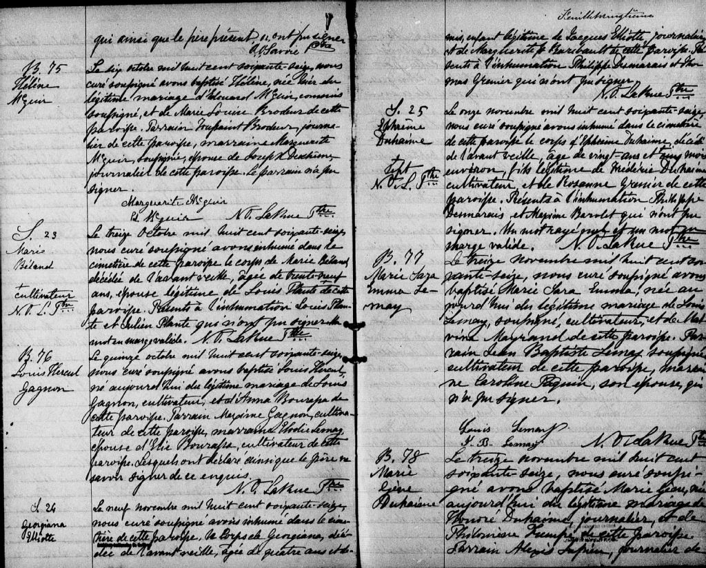 Cette série regroupe les registres originaux de l'état civil, lesquels contiennent les enregistrements de baptêmes, de mariages et de sépultures consignés par le curé ou son représentant au cours de la période concernée par les documents.Outre les renseignements à caractère généalogique que nous pouvons y puiser, cette série peut constituer une source documentaire importante pour toute étude-statistique ou comparative sur les conditions de vie à différentes époques (mortalité infantile, espérance de vie) ou pour toute recherche portant sur l'occupation des terres (lieu de résidence), sur le mode de vie (métiers et professions, statut et âge des époux), sur les classes sociales (titres des parties impliquées, témoins/amis/parents présents lors d'un mariage), sur des évènements spéciaux (quelques mentions dans les sépultures) et sur des sujets à incidence médicale tels les maladies héréditaires (cause du décès)