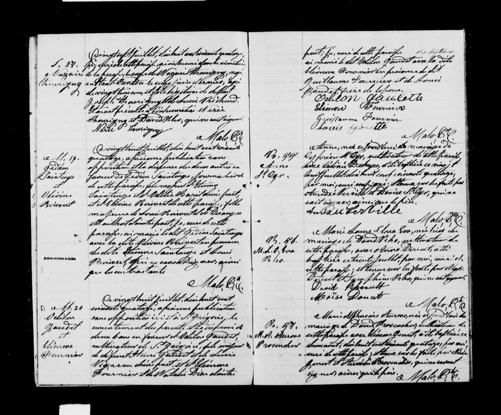 - Cette série regroupe les registres originaux de l'état civil, lesquels contiennent les enregistrements de baptêmes, de mariages et de sépultures consignés par le curé ou son représentant au cours de la période concernée par les documents.Outre les renseignements à caractère généalogique que nous pouvons y puiser, cette série peut constituer une source documentaire importante pour toute étude-statistique ou comparative sur les conditions de vie à différentes époques (mortalité infantile, espérance de vie) ou pour toute recherche portant sur l'occupation des terres (lieu de résidence), sur le mode de vie (métiers et professions, statut et âge des époux), sur les classes sociales (titres des parties impliquées, témoins/amis/parents présents lors d'un mariage), sur des évènements spéciaux (quelques mentions dans les sépultures) et sur des sujets à incidence médicale tels les maladies héréditaires (cause du décès)