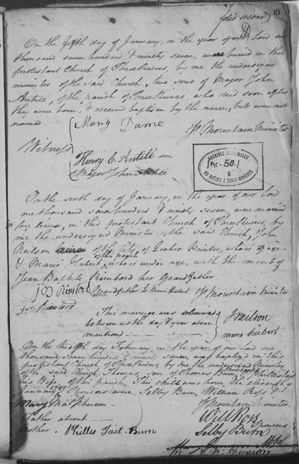 - Cette série regroupe les registres originaux de l'état civil, lesquels contiennent les enregistrements de baptêmes, de mariages et de sépultures consignés par le curé ou son représentant au cours de la période concernée par les documents.Outre les renseignements à caractère généalogique que nous pouvons y puiser, cette série peut constituer une source documentaire importante pour toute étude-statistique ou comparative sur les conditions de vie à différentes époques (mortalité infantile, espérance de vie) ou pour toute recherche portant sur l'occupation des terres (lieu de résidence), sur le mode de vie (métiers et professions, statut et âge des époux), sur les classes sociales (titres des parties impliquées, témoins/amis/parents présents lors d'un mariage), sur des évènements spéciaux (quelques mentions dans les sépultures) et sur des sujets à incidence médicale tels les maladies héréditaires (cause du décès)