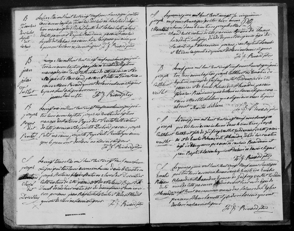 - Cette série regroupe les registres originaux de l'état civil, lesquels contiennent les enregistrements de baptêmes, de mariages et de sépultures consignés par le curé ou son représentant au cours de la période concernée par les documents.Outre les renseignements à caractère généalogique que nous pouvons y puiser, cette série peut constituer une source documentaire importante pour toute étude-statistique ou comparative sur les conditions de vie à différentes époques (mortalité infantile, espérance de vie) ou pour toute recherche portant sur l'occupation des terres (lieu de résidence), sur le mode de vie (métiers et professions, statut et âge des époux), sur les classes sociales (titres des parties impliquées, témoins/amis/parents présents lors d'un mariage), sur des évènements spéciaux (quelques mentions dans les sépultures) et sur des sujets à incidence médicale tels les maladies héréditaires (cause du décès).Cette série contient les manuscrits originaux des registres civils (1679-1900), des transcriptions des reqistres civils (1679-1776) et des photocopies de registres paroissiaux (1680-1744). Toutes catégories confondues, il manquerait les actes de janvier à septembre 1744, 1746-1749, 1751-1752 et 1764 à novembre 1774. Pour ces années, le chercheur doit consulter les registres paroissiaux
