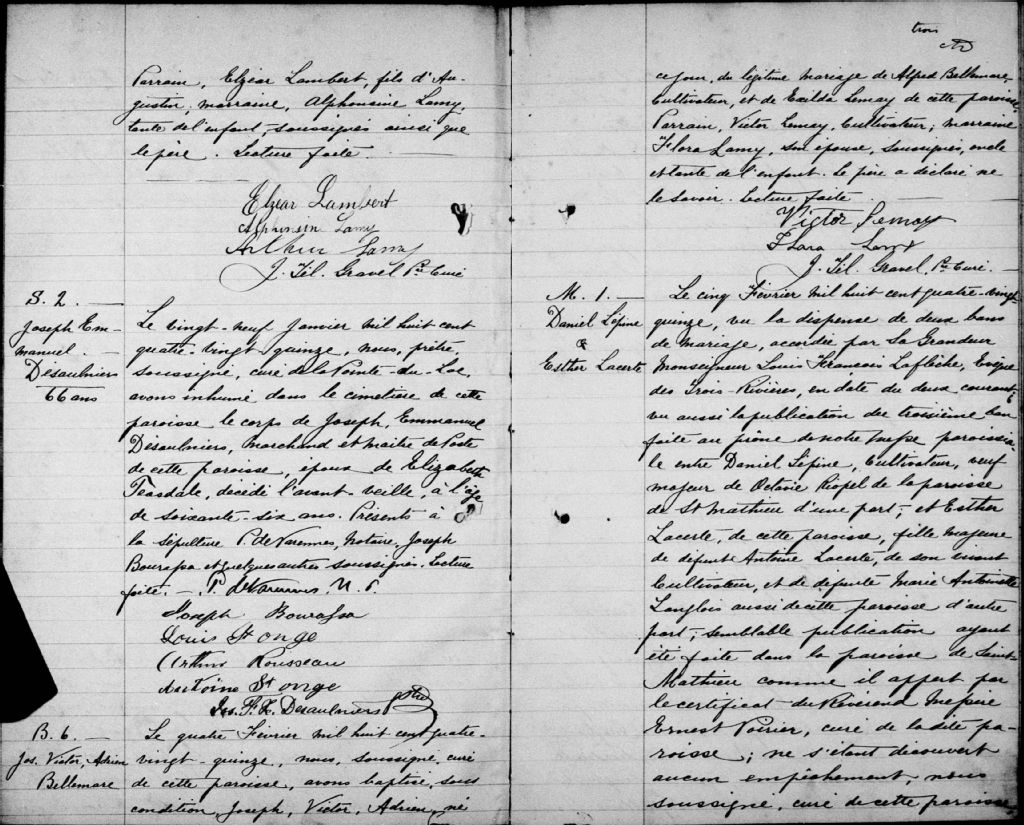- Cette série regroupe les registres originaux de l'état civil, lesquels contiennent les enregistrements de baptêmes, de mariages et de sépultures consignés par le curé ou son représentant au cours de la période concernée par les documents.Outre les renseignements à caractère généalogique que nous pouvons y puiser, cette série peut constituer une source documentaire importante pour toute étude-statistique ou comparative sur les conditions de vie à différentes époques (mortalité infantile, espérance de vie) ou pour toute recherche portant sur l'occupation des terres (lieu de résidence), sur le mode de vie (métiers et professions, statut et âge des époux), sur les classes sociales (titres des parties impliquées, témoins/amis/parents présents lors d'un mariage), sur des évènements spéciaux (quelques mentions dans les sépultures) et sur des sujets à incidence médicale tels les maladies héréditaires (cause du décès)