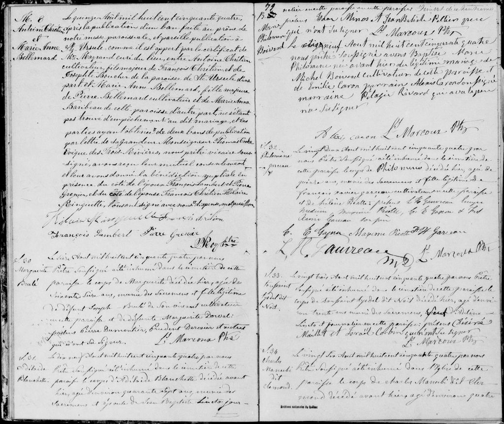 Cette série regroupe les registres originaux de l'état civil, lesquels contiennent les enregistrements de baptêmes, de mariages et de sépultures consignés par le curé ou son représentant au cours de la période concernée par les documents.Outre les renseignements à caractère généalogique que nous pouvons y puiser, cette série peut constituer une source documentaire importante pour toute étude-statistique ou comparative sur les conditions de vie à différentes époques (mortalité infantile, espérance de vie) ou pour toute recherche portant sur l'occupation des terres (lieu de résidence), sur le mode de vie (métiers et professions, statut et âge des époux), sur les classes sociales (titres des parties impliquées, témoins/amis/parents présents lors d'un mariage), sur des évènements spéciaux (quelques mentions dans les sépultures) et sur des sujets à incidence médicale tels les maladies héréditaires (cause du décès)