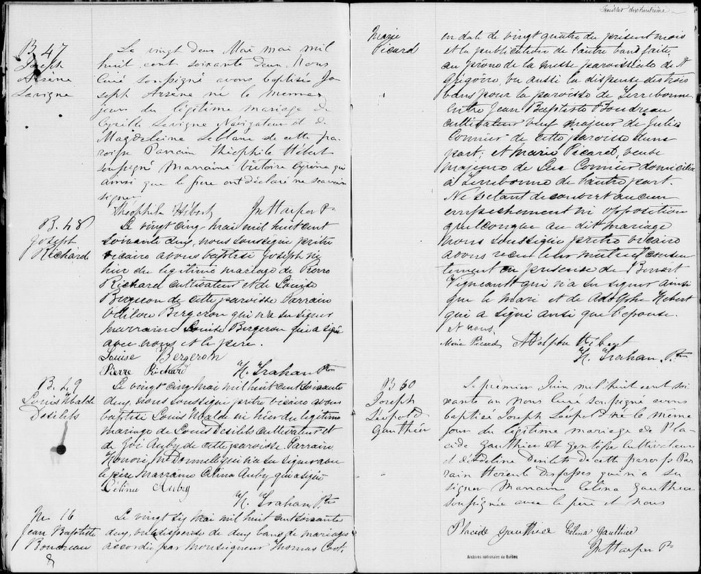 - Cette série regroupe les registres originaux de l'état civil, lesquels contiennent les enregistrements de baptêmes, de mariages et de sépultures consignés par le curé ou son représentant au cours de la période concernée par les documents.Outre les renseignements à caractère généalogique que nous pouvons y puiser, cette série peut constituer une source documentaire importante pour toute étude-statistique ou comparative sur les conditions de vie à différentes époques (mortalité infantile, espérance de vie) ou pour toute recherche portant sur l'occupation des terres (lieu de résidence), sur le mode de vie (métiers et professions, statut et âge des époux), sur les classes sociales (titres des parties impliquées, témoins/amis/parents présents lors d'un mariage), sur des évènements spéciaux (quelques mentions dans les sépultures) et sur des sujets à incidence médicale tels les maladies héréditaires (cause du décès)