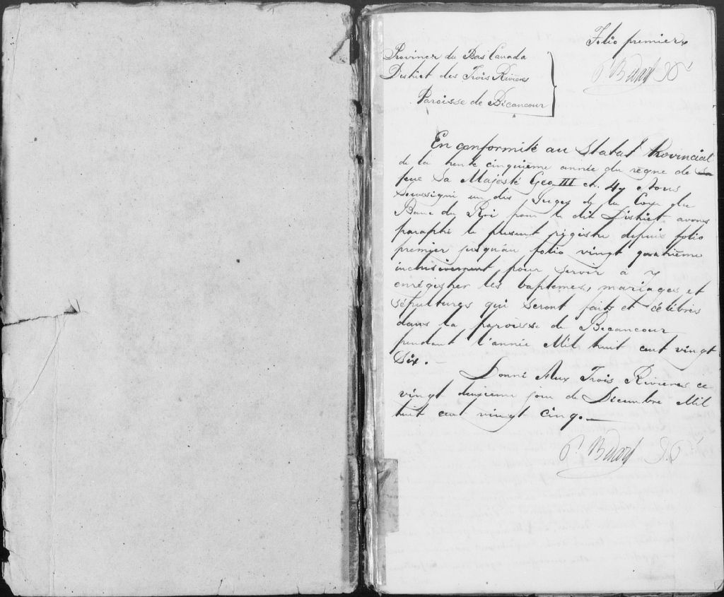 Cette série regroupe les registres originaux de l'état civil, lesquels contiennent les enregistrements de baptêmes, de mariages et de sépultures consignés par le curé ou son représentant au cours de la période concernée par les documents.Outre les renseignements à caractère généalogique que nous pouvons y puiser, cette série peut constituer une source documentaire importante pour toute étude-statistique ou comparative sur les conditions de vie à différentes époques (mortalité infantile, espérance de vie) ou pour toute recherche portant sur l'occupation des terres (lieu de résidence), sur le mode de vie (métiers et professions, statut et âge des époux), sur les classes sociales (titres des parties impliquées, témoins/amis/parents présents lors d'un mariage), sur des évènements spéciaux (quelques mentions dans les sépultures) et sur des sujets à incidence médicale tels les maladies héréditaires (cause du décès)