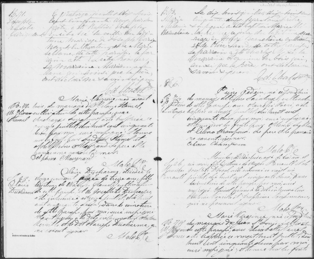 - Cette série regroupe les registres originaux de l'état civil, lesquels contiennent les enregistrements de baptêmes, de mariages et de sépultures consignés par le curé ou son représentant au cours de la période concernée par les documents.Outre les renseignements à caractère généalogique que nous pouvons y puiser, cette série peut constituer une source documentaire importante pour toute étude-statistique ou comparative sur les conditions de vie à différentes époques (mortalité infantile, espérance de vie) ou pour toute recherche portant sur l'occupation des terres (lieu de résidence), sur le mode de vie (métiers et professions, statut et âge des époux), sur les classes sociales (titres des parties impliquées, témoins/amis/parents présents lors d'un mariage), sur des évènements spéciaux (quelques mentions dans les sépultures) et sur des sujets à incidence médicale tels les maladies héréditaires (cause du décès)