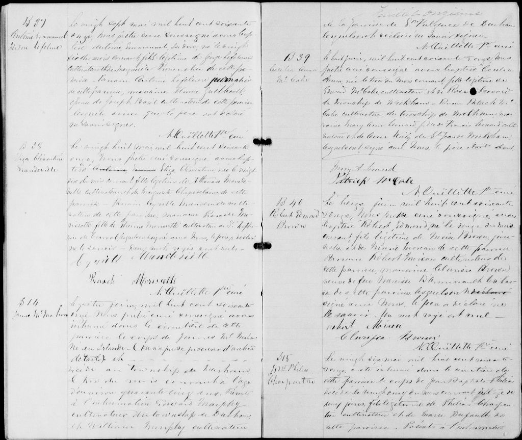 - Cette série regroupe les registres originaux de l'état civil, lesquels contiennent les enregistrements de baptêmes, de mariages et de sépultures consignés par le curé ou son représentant au cours de la période concernée par les documents.Outre les renseignements à caractère généalogique que nous pouvons y puiser, cette série peut constituer une source documentaire importante pour toute étude-statistique ou comparative sur les conditions de vie à différentes époques (mortalité infantile, espérance de vie) ou pour toute recherche portant sur l'occupation des terres (lieu de résidence), sur le mode de vie (métiers et professions, statut et âge des époux), sur les classes sociales (titres des parties impliquées, témoins/amis/parents présents lors d'un mariage), sur des évènements spéciaux (quelques mentions dans les sépultures) et sur des sujets à incidence médicale tels les maladies héréditaires (cause du décès)