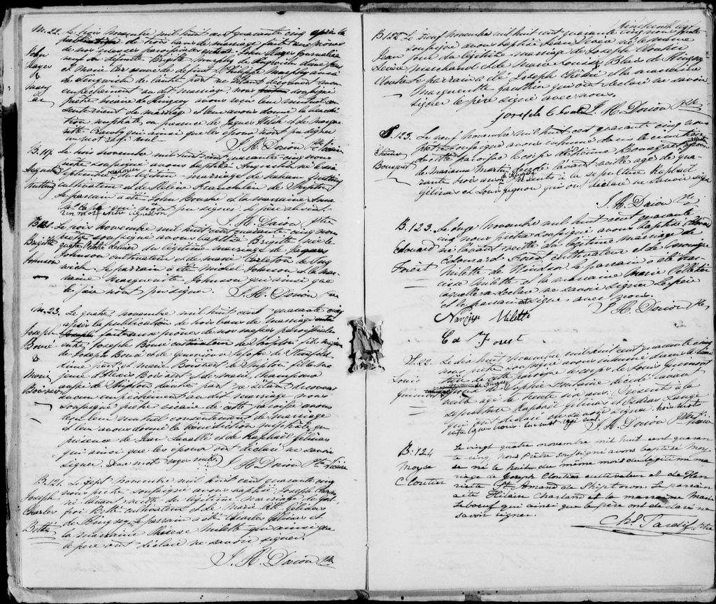 - Cette série regroupe les registres originaux de l'état civil, lesquels contiennent les enregistrements de baptêmes, de mariages et de sépultures consignés par le curé ou son représentant au cours de la période concernée par les documents.Outre les renseignements à caractère généalogique que nous pouvons y puiser, cette série peut constituer une source documentaire importante pour toute étude-statistique ou comparative sur les conditions de vie à différentes époques (mortalité infantile, espérance de vie) ou pour toute recherche portant sur l'occupation des terres (lieu de résidence), sur le mode de vie (métiers et professions, statut et âge des époux), sur les classes sociales (titres des parties impliquées, témoins/amis/parents présents lors d'un mariage), sur des évènements spéciaux (quelques mentions dans les sépultures) et sur des sujets à incidence médicale tels les maladies héréditaires (cause du décès)