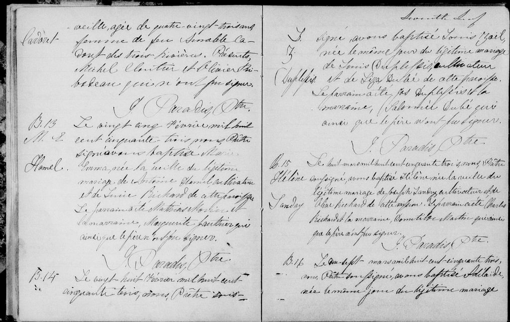 - Cette série regroupe les registres originaux de l'état civil, lesquels contiennent les enregistrements de baptêmes, de mariages et de sépultures consignés par le curé ou son représentant au cours de la période concernée par les documents.Outre les renseignements à caractère généalogique que nous pouvons y puiser, cette série peut constituer une source documentaire importante pour toute étude-statistique ou comparative sur les conditions de vie à différentes époques (mortalité infantile, espérance de vie) ou pour toute recherche portant sur l'occupation des terres (lieu de résidence), sur le mode de vie (métiers et professions, statut et âge des époux), sur les classes sociales (titres des parties impliquées, témoins/amis/parents présents lors d'un mariage), sur des évènements spéciaux (quelques mentions dans les sépultures) et sur des sujets à incidence médicale tels les maladies héréditaires (cause du décès)