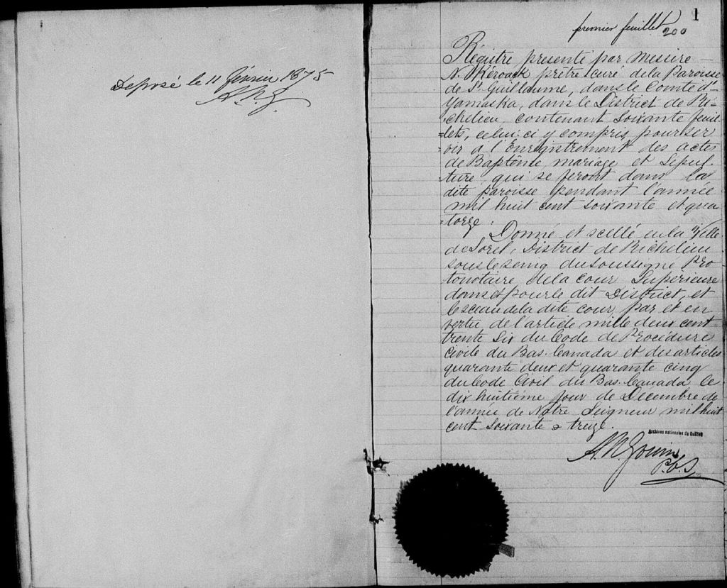 Saint-Guillaume, 1835-1922, Archives nationales à Trois-Rivières, Fonds Cour supérieure. District judiciaire de Drummond. État civil, (04T,CE403,S11).