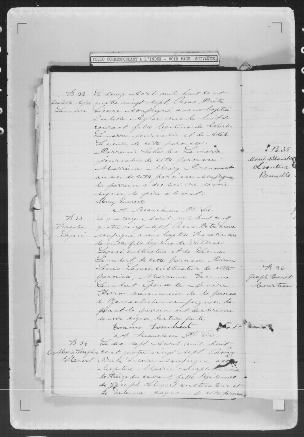 - Cette série regroupe les registres originaux de l'état civil, lesquels contiennent les enregistrements de baptêmes, de mariages et de sépultures consignés par le curé ou son représentant au cours de la période concernée par les documents.Outre les renseignements à caractère généalogique que nous pouvons y puiser, cette série peut constituer une source documentaire importante pour toute étude-statistique ou comparative sur les conditions de vie à différentes époques (mortalité infantile, espérance de vie) ou pour toute recherche portant sur l'occupation des terres (lieu de résidence), sur le mode de vie (métiers et professions, statut et âge des époux), sur les classes sociales (titres des parties impliquées, témoins/amis/parents présents lors d'un mariage), sur des évènements spéciaux (quelques mentions dans les sépultures) et sur des sujets à incidence médicale tels les maladies héréditaires (cause du décès)