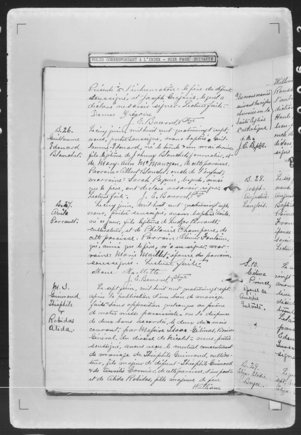 - Cette série regroupe les registres originaux de l'état civil, lesquels contiennent les enregistrements de baptêmes, de mariages et de sépultures consignés par le curé ou son représentant au cours de la période concernée par les documents.Outre les renseignements à caractère généalogique que nous pouvons y puiser, cette série peut constituer une source documentaire importante pour toute étude-statistique ou comparative sur les conditions de vie à différentes époques (mortalité infantile, espérance de vie) ou pour toute recherche portant sur l'occupation des terres (lieu de résidence), sur le mode de vie (métiers et professions, statut et âge des époux), sur les classes sociales (titres des parties impliquées, témoins/amis/parents présents lors d'un mariage), sur des évènements spéciaux (quelques mentions dans les sépultures) et sur des sujets à incidence médicale tels les maladies héréditaires (cause du décès)