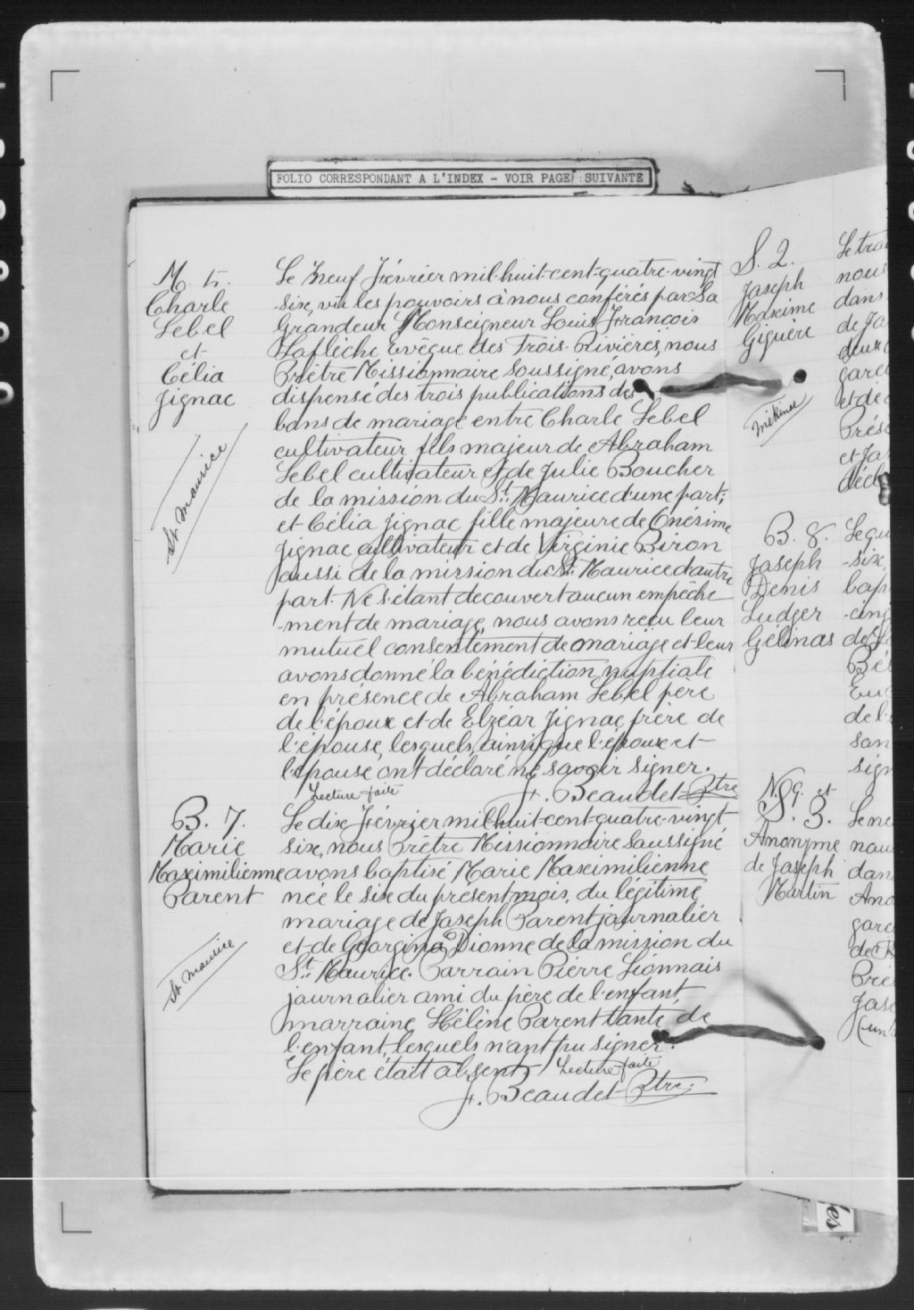 - Cette série regroupe les registres originaux de l'état civil, lesquels contiennent les enregistrements de baptêmes, de mariages et de sépultures consignés par le curé ou son représentant au cours de la période concernée par les documents; des index sont également disponibles à la fin de chacun des registres.Outre les renseignements à caractère généalogique que nous pouvons y puiser, cette série peut constituer une source documentaire importante pour toute étude-statistique ou comparative sur les conditions de vie à différentes époques (mortalité infantile, espérance de vie) ou pour toute recherche portant sur l'occupation des terres (lieu de résidence), sur le mode de vie (métiers et professions, statut et âge des époux), sur les classes sociales (titres des parties impliquées, témoins/amis/parents présents lors d'un mariage), sur des évènements spéciaux (quelques mentions dans les sépultures) et sur des sujets à incidence médicale tels les maladies héréditaires (cause du décès).Cette série regroupe les registres originaux de l'état civil, lesquels contiennent les enregistrements de baptêmes, de mariages et de sépultures consignés par le curé ou son représentant au cours de la période concernée par les documents; des index sont également disponibles à la fin de chacun des registres