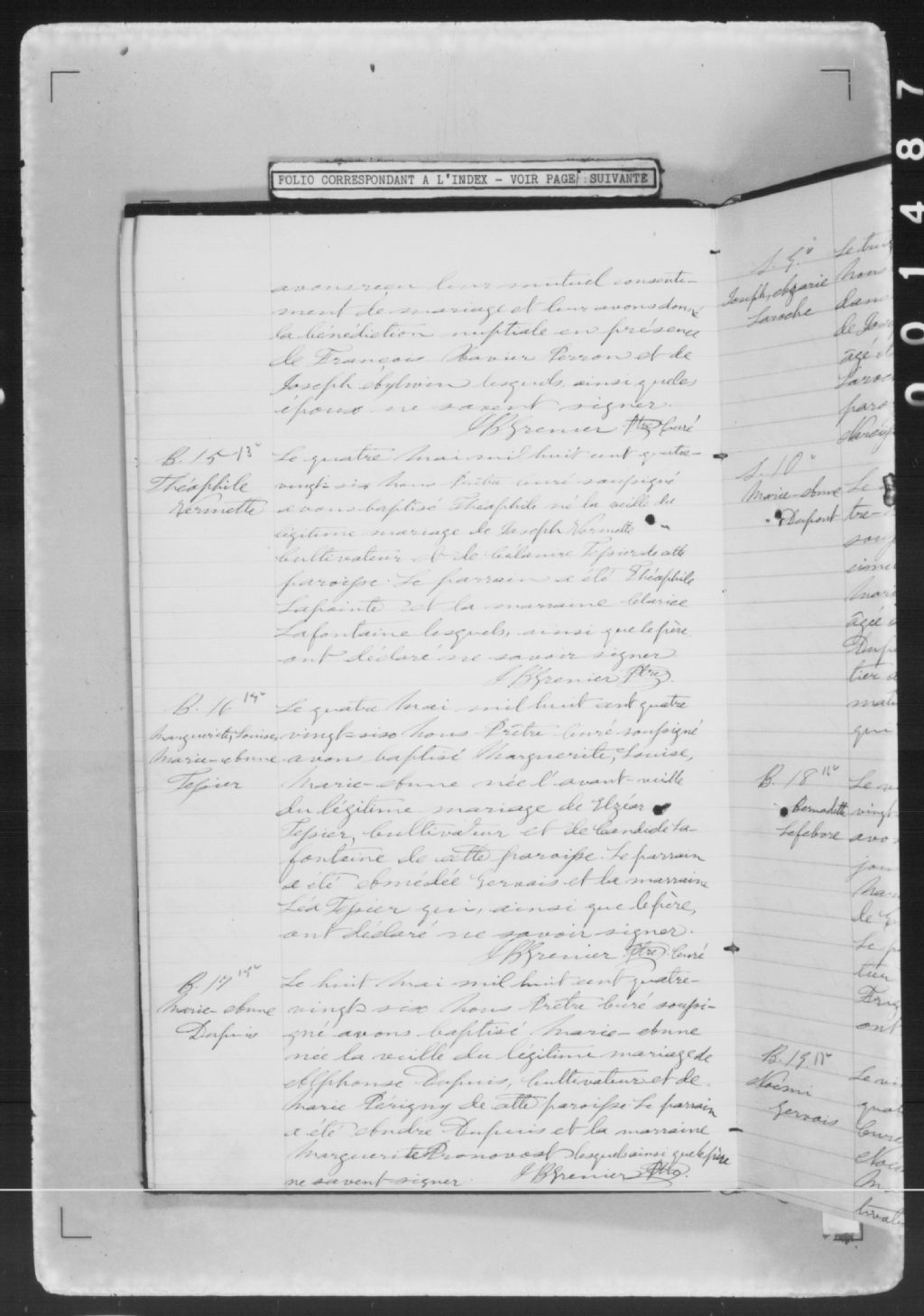 Cette série regroupe les registres originaux de l'état civil, lesquels contiennent les enregistrements de baptêmes, de mariages et de sépultures consignés par le curé ou son représentant au cours de la période concernée par les documents.Outre les renseignements à caractère généalogique que nous pouvons y puiser, cette série peut constituer une source documentaire importante pour toute étude-statistique ou comparative sur les conditions de vie à différentes époques (mortalité infantile, espérance de vie) ou pour toute recherche portant sur l'occupation des terres (lieu de résidence), sur le mode de vie (métiers et professions, statut et âge des époux), sur les classes sociales (titres des parties impliquées, témoins/amis/parents présents lors d'un mariage), sur des évènements spéciaux (quelques mentions dans les sépultures) et sur des sujets à incidence médicale tels les maladies héréditaires (cause du décès)