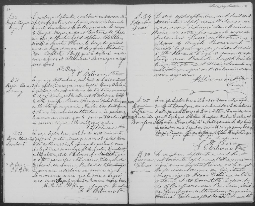- Cette série regroupe les registres originaux de l'état civil, lesquels contiennent les enregistrements de baptêmes, de mariages et de sépultures consignés par le curé ou son représentant au cours de la période concernée par les documents.Outre les renseignements à caractère généalogique que nous pouvons y puiser, cette série peut constituer une source documentaire importante pour toute étude-statistique ou comparative sur les conditions de vie à différentes époques (mortalité infantile, espérance de vie) ou pour toute recherche portant sur l'occupation des terres (lieu de résidence), sur le mode de vie (métiers et professions, statut et âge des époux), sur les classes sociales (titres des parties impliquées, témoins/amis/parents présents lors d'un mariage), sur des évènements spéciaux (quelques mentions dans les sépultures) et sur des sujets à incidence médicale tels les maladies héréditaires (cause du décès)