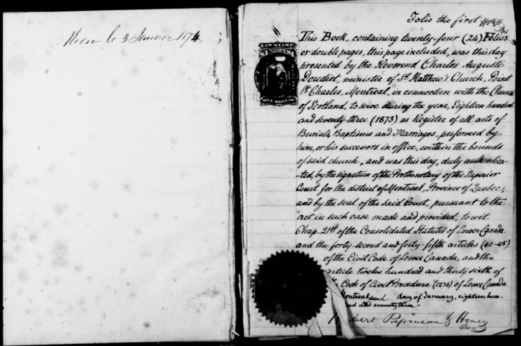 St. Mathew's Presbyterian Church, 1860-1922, Archives nationales à Montréal, Fonds Cour supérieure. District judiciaire de Montréal. État civil, (06M,CE601,S129).