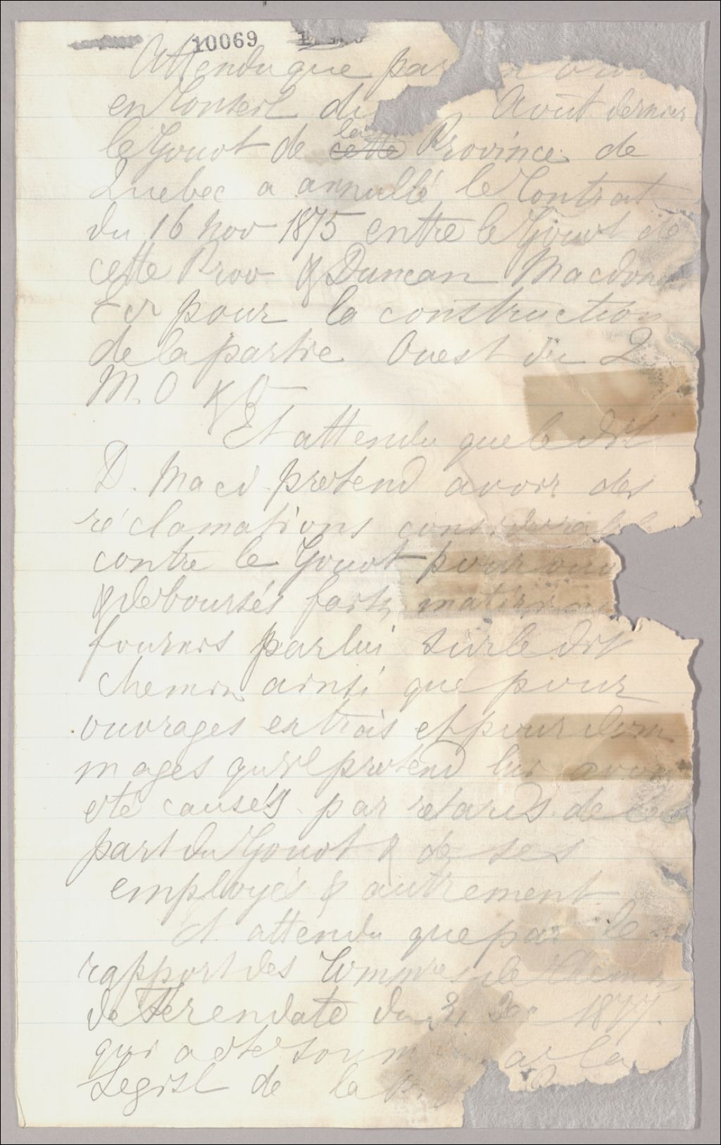Copie d'une résolution recommandant la nomination de Walter Shanly comme arbitre entre le gouvernement et Duncan Macdonald, 1878, Archives nationales à Québec, Fonds Famille Joly de Lotbinière, (03Q,P351,S4,SS3,P10069).