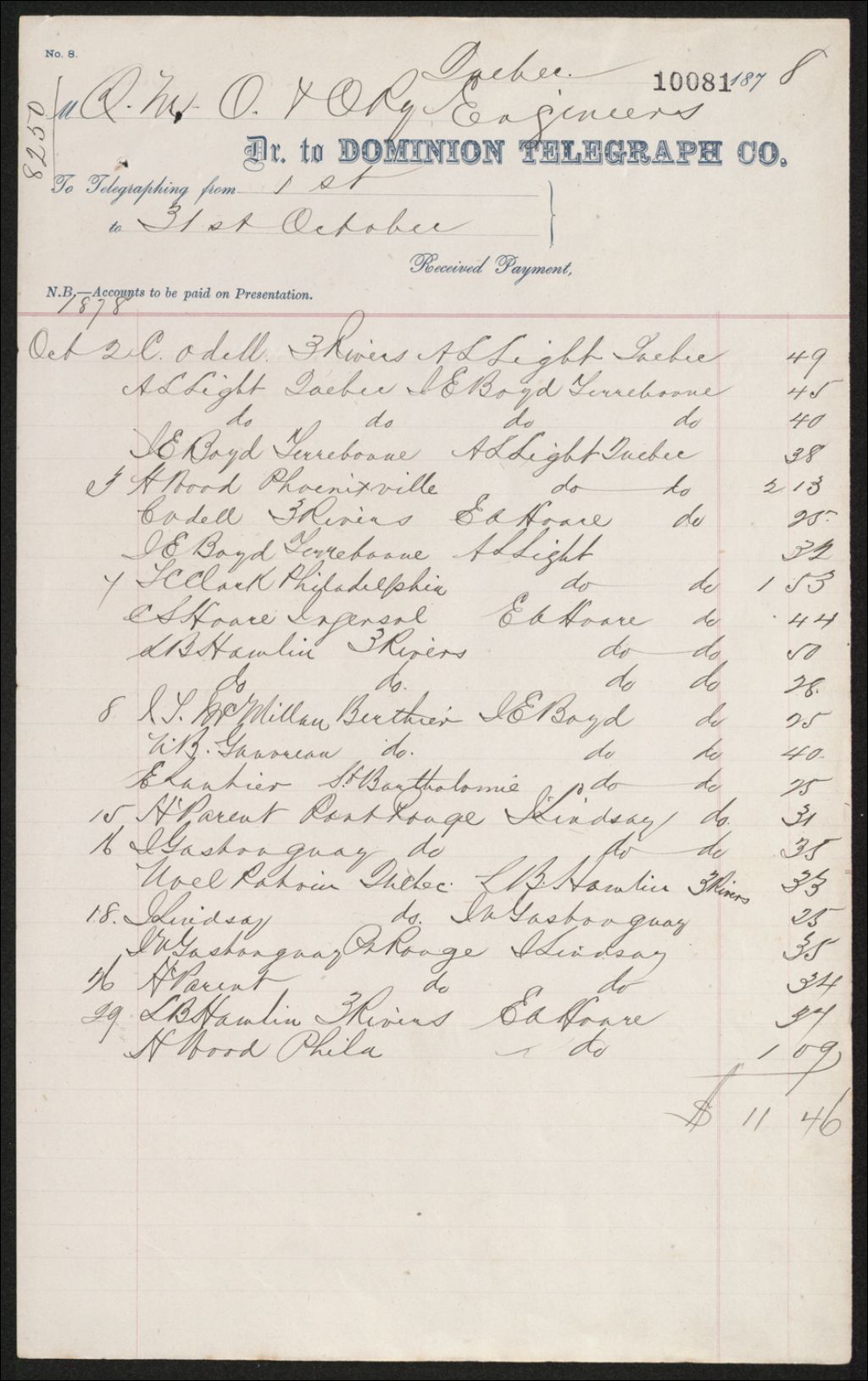 Compte du Chemin de fer Québec, Montréal, Ottawa et Occidental (QMO&O) envers la Dominion Telegraph Co, octobre 1878, Archives nationales à Québec, Fonds Famille Joly de Lotbinière, (03Q,P351,S4,SS3,P10081).