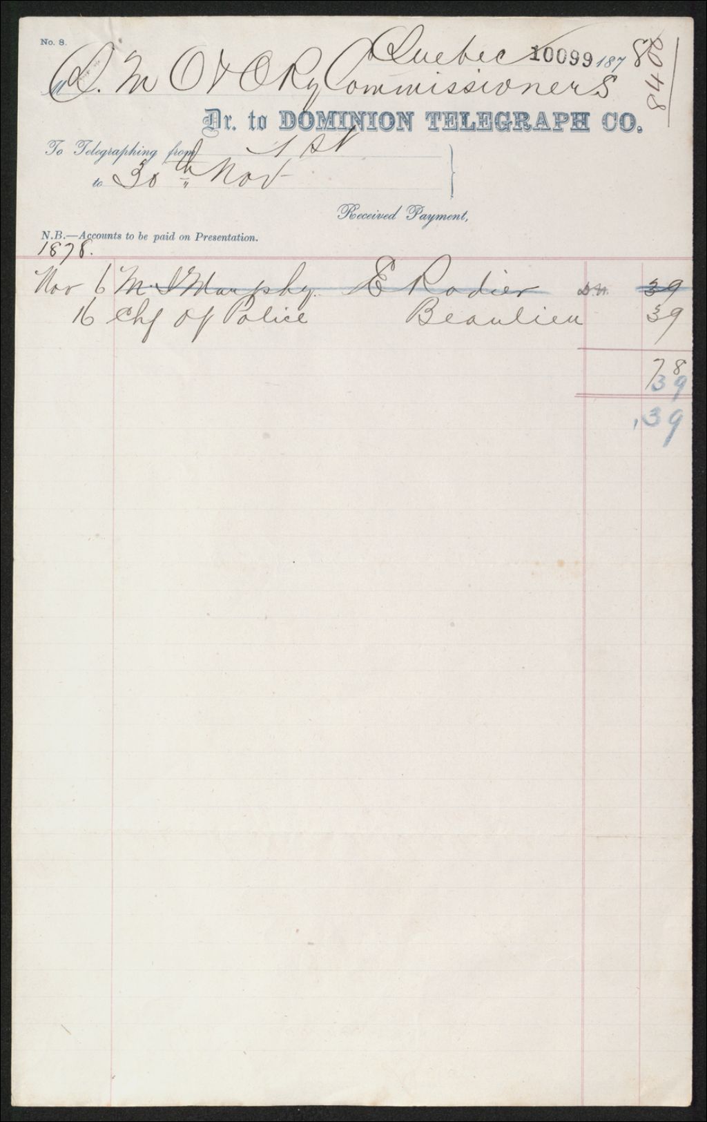 Compte de la Commission du Chemin de fer Québec, Montréal, Ottawa et Occidental (QMO&O) envers la Dominion Telegraph Co., novembre 1878, Archives nationales à Québec, Fonds Famille Joly de Lotbinière, (03Q,P351,S4,SS3,P10099).