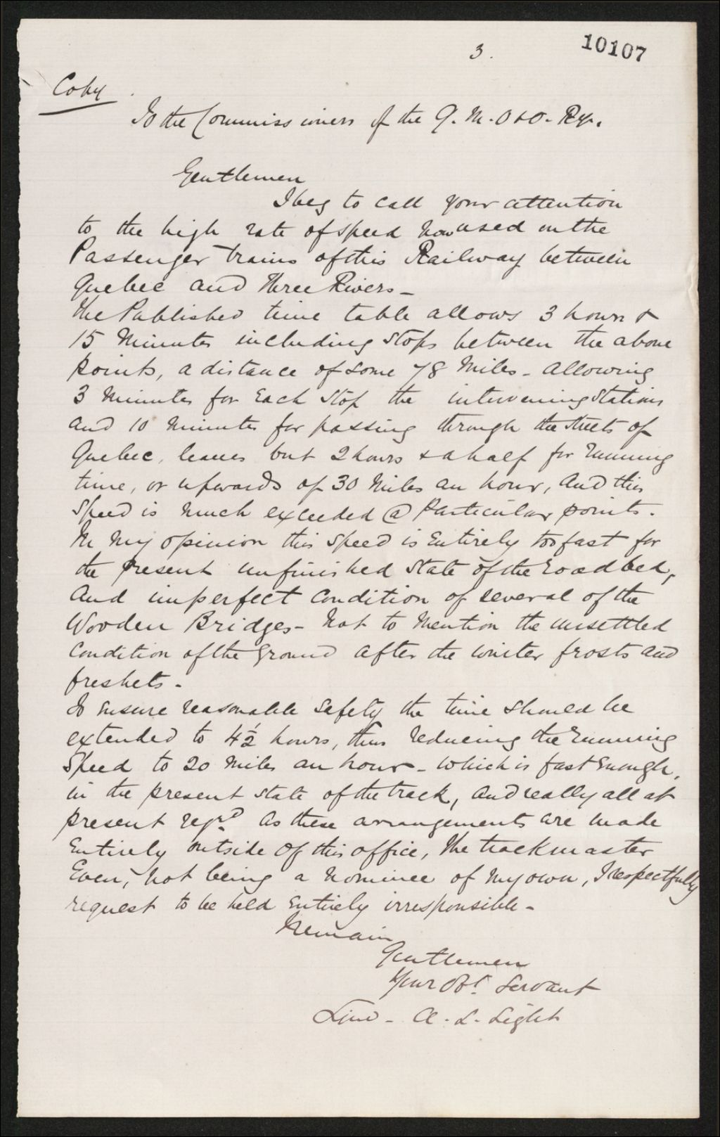 Copie de lettre d'A. L. Light aux commissaires du Chemin de fer Québec, Montréal, Ottawa et Occidental (QMO&O), vers 1878, Archives nationales à Québec, Fonds Famille Joly de Lotbinière, (03Q,P351,S4,SS3,P10107).