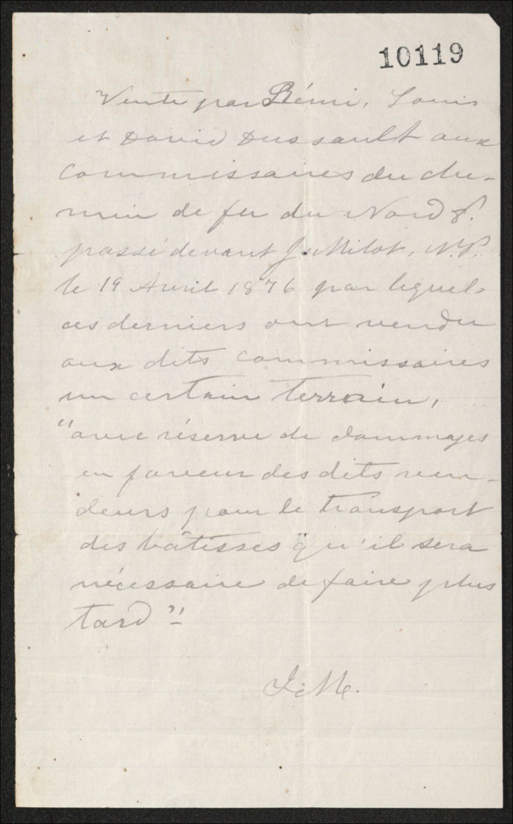 Note sur la vente par Rémi, Louis et David Dussault aux commissaires du chemin de fer du Nord, d'un terrain "avec réserve de dommages en faveur des vendeurs pour le transport des bâtisses qu'il sera nécessaire de faire plus tard"