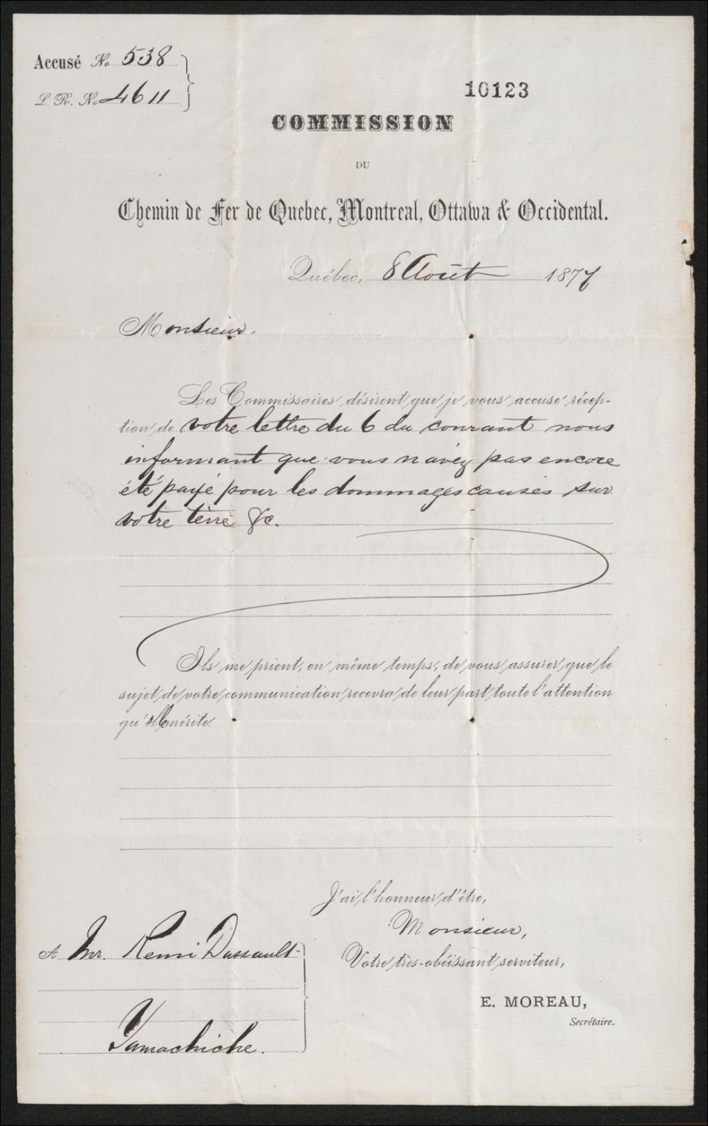 Accusé de réception de la commission du Chemin de fer Québec, Montréal, Ottawa et Occidental (QMO&O) à Rémi Dussault, 1877, Archives nationales à Québec, Fonds Famille Joly de Lotbinière, (03Q,P351,S4,SS3,P10123).