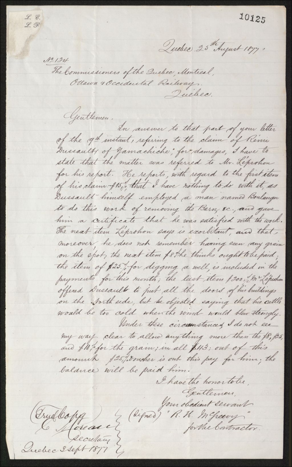 Copie de lettre de R. H. McGreevy au commissaires du Chemin de fer Québec, Montréal, Ottawa et Occidental (QMO&O), 1877, Archives nationales à Québec, Fonds Famille Joly de Lotbinière, (03Q,P351,S4,SS3,P10125).