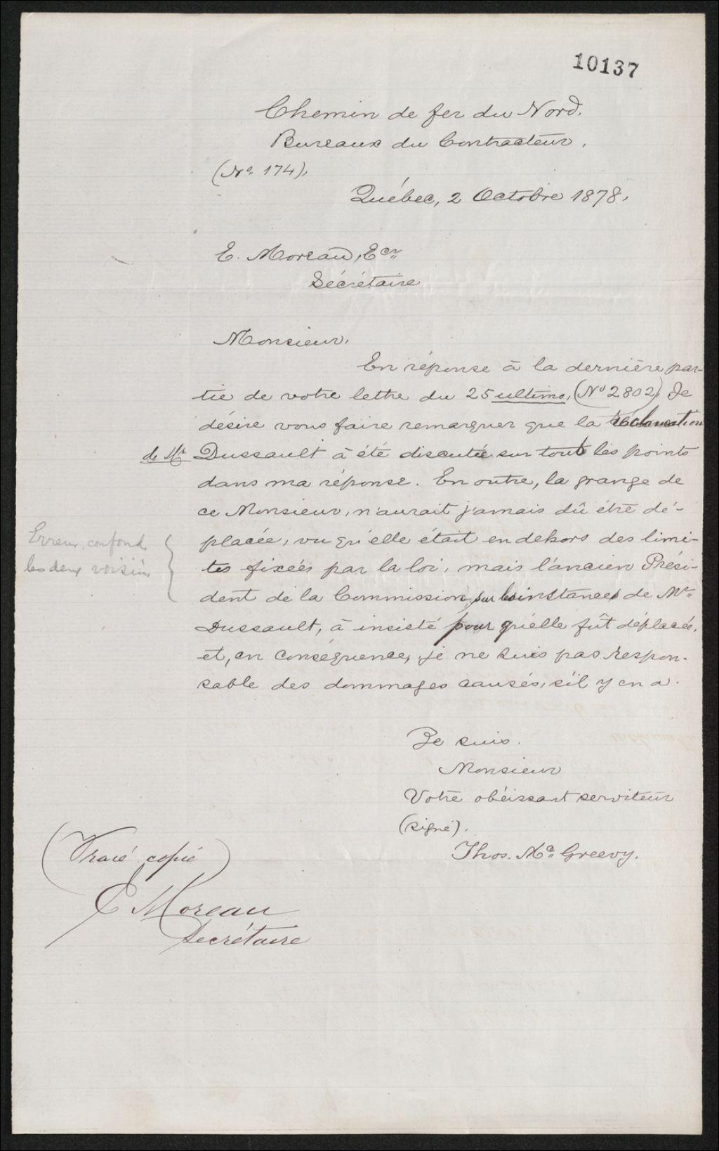 Copie de lettre de Thos McGreevy à E. Moreau, 2 octobre 1878, Archives nationales à Québec, Fonds Famille Joly de Lotbinière, (03Q,P351,S4,SS3,P10137).