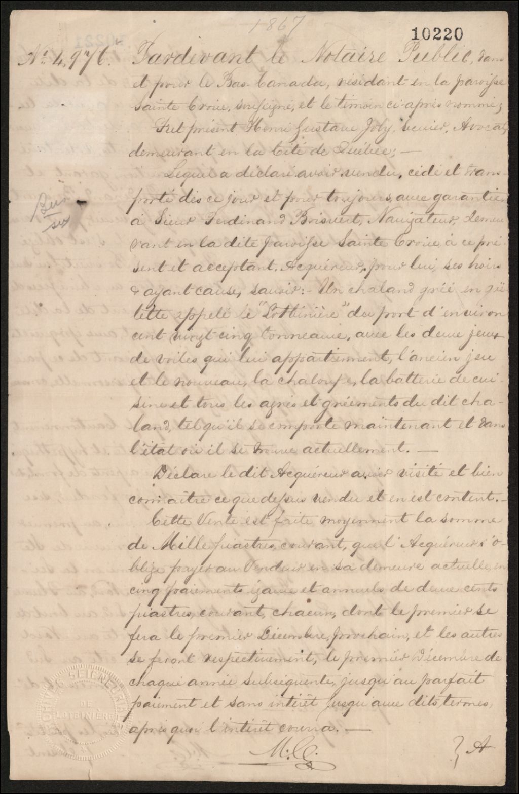 Vente d'un chaland par Henri-Gustave Joly à Ferdinand Boisvert, 1867, Archives nationales à Québec, Fonds Famille Joly de Lotbinière, (03Q,P351,S4,SS3,P10220).