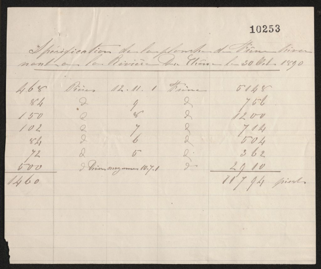 Spécification de la planche de frêne hivernant à la rivière Duchêne le 30 octobre 1890, 30 octobre 1890, Archives nationales à Québec, Fonds Famille Joly de Lotbinière, (03Q,P351,S4,SS3,P10253).