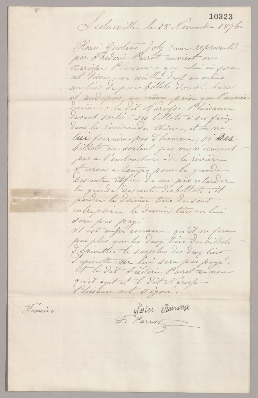 Contrat de billots, 1876, Archives nationales à Québec, Fonds Famille Joly de Lotbinière, (03Q,P351,S4,SS3,P10323).